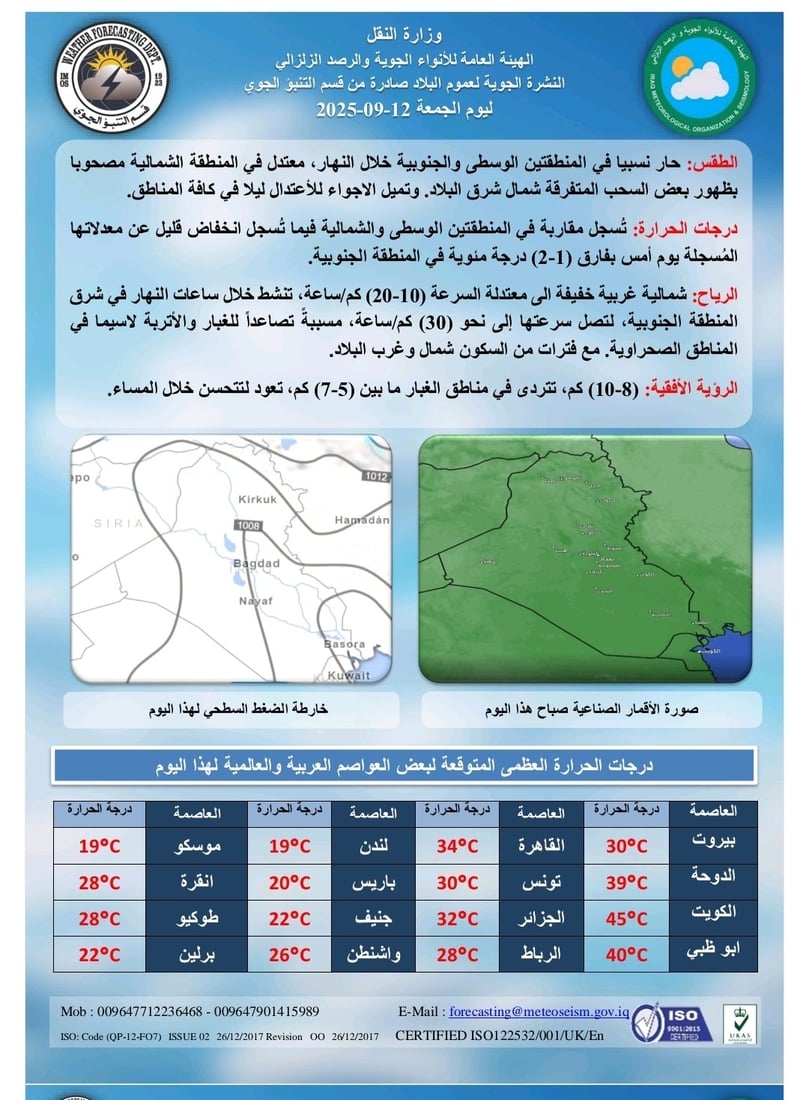 توقعت هيئة الأنواء الجوية، اليوم الجمعة، أن تشهد المنطقتان الوسطى والجنوبية طقساً حاراً نسبياً نهاراً، بينما يكون معتدلاً في شمال البلاد، مع ظهور سحب متفرقة في الأجزاء الشمالية والشرقية.
