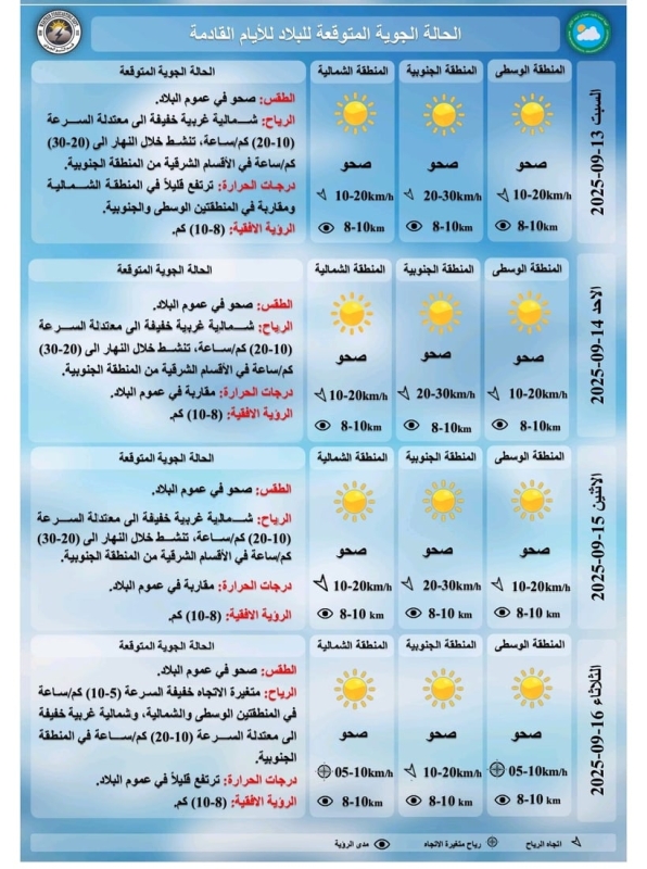 وبشأن حركة الرياح، من المتوقع أن تكون شمالية غربية خفيفة إلى معتدلة السرعة، تنشط في شرق المنطقة الجنوبية خلال النهار، مما يتسبب في تصاعد الغبار والأتربة، خاصة في المناطق الصحراوية، بينما تشهد مناطق الشمال والغرب فترات من السكون.