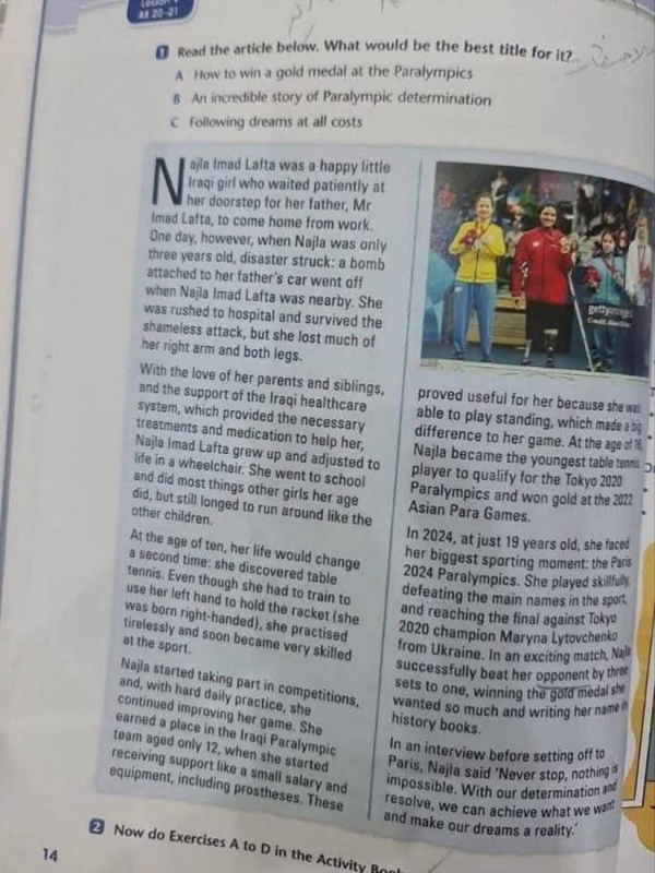 علّقت البطلة البارالمبية العراقية نجلة عماد، على قرار وزارة التربية تضمين قصتها ضمن منهاج مادة اللغة الإنجليزية للصف السادس الإعدادي للموسم الدراسي 2026، معتبرةً هذا التكريم "مسؤولية كبيرة ورسالة تحفيزية للطلبة".