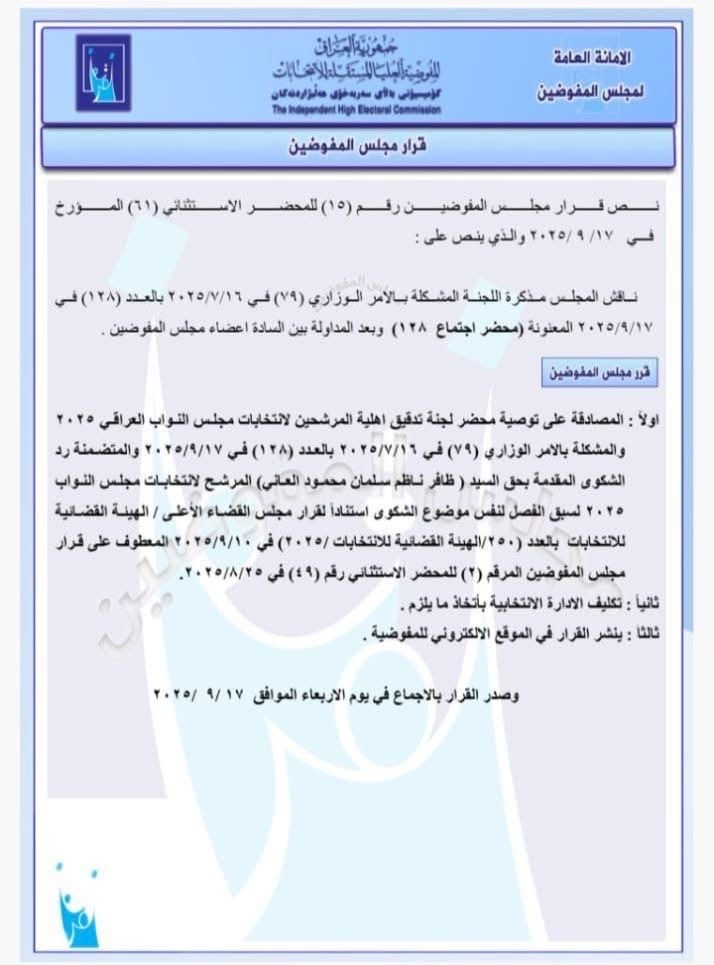 أعلنت المفوضية العليا المستقلة للانتخابات ردّ الشكوى المقدّمة ضد مرشّح حزب تقدّم في بغداد ظافر العاني، مؤكدة عدم وجود ما يثبت مخالفة قانونية تعيق ترشحه.