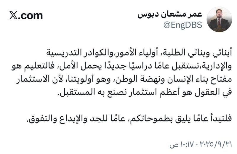 وكتب دبوس في تغريدة على حسابه في منصة "إكس"، "أبنائي وبناتي الطلبة، أولياء الأمور، والكوادر التدريسية والإدارية، نستقبل عامًا دراسيًا جديدًا يحمل الأمل، فالتعليم هو مفتاح بناء الإنسان ونهضة الوطن، وهو أولويتنا، لأن الاستثمار في العقول هو أعظم استثمار نصنع به المستقبل".