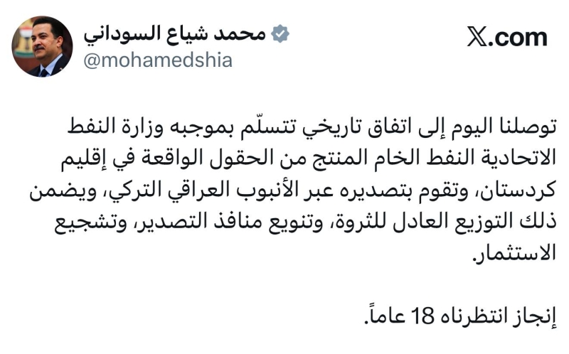 وكتب السوداني عبر حسابه في منصة إكس تغريدة تابعتها "الديرة"، قال فيها: توصلنا اليوم إلى اتفاق تاريخي تتسلّم بموجبه وزارة النفط الاتحادية النفط الخام المنتج من الحقول الواقعة في إقليم كردستان وتقوم بتصديره عبر الأنبوب العراقي التركي".