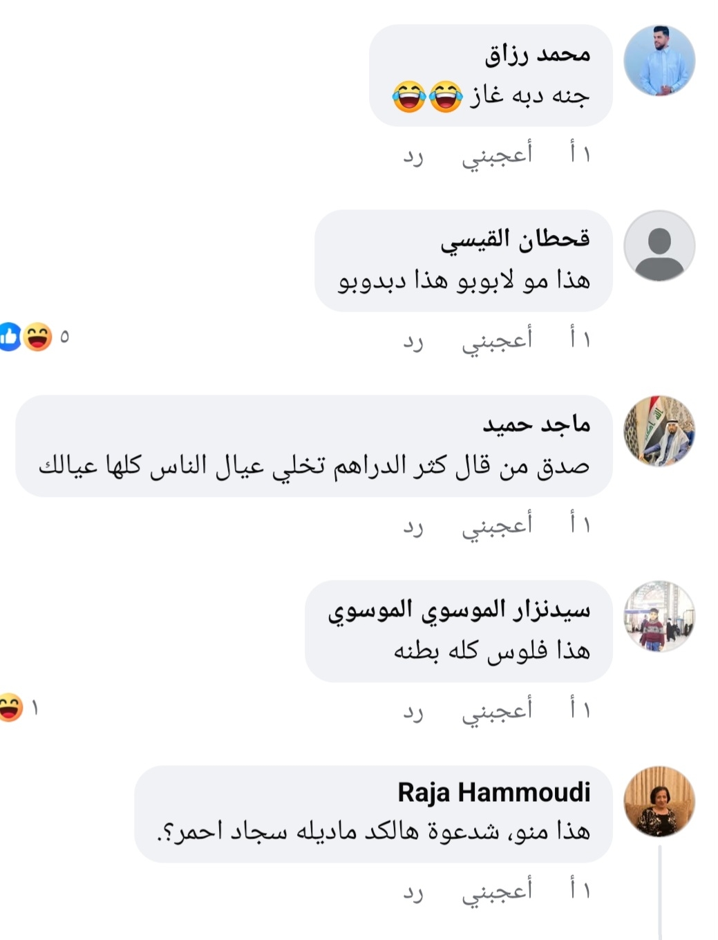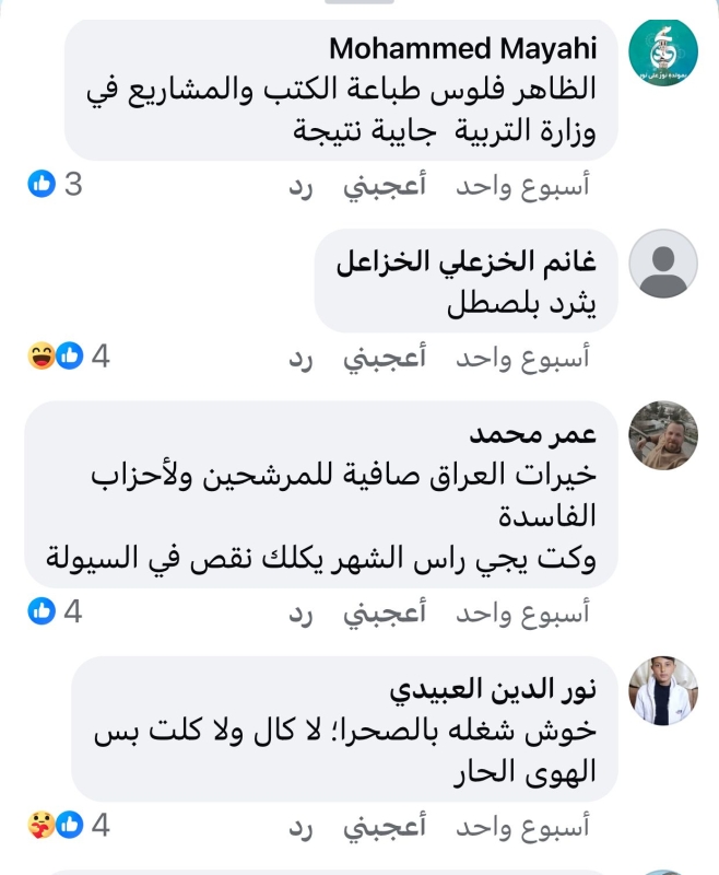 فيما لم يترك آخرون مثل "محمد مياحي" فرصة السخرية من أموال طباعة الكتب في وزارة التربية التي "جابت نتيجتها" على حد تعبيره، في إشارة إلى الأموال المنهوبة من وزارة التربية وقضية طباعة الكتب، بينما وجّه "عمر محمد" اتهاماته المباشرة لحزب مثنى السامرائي.