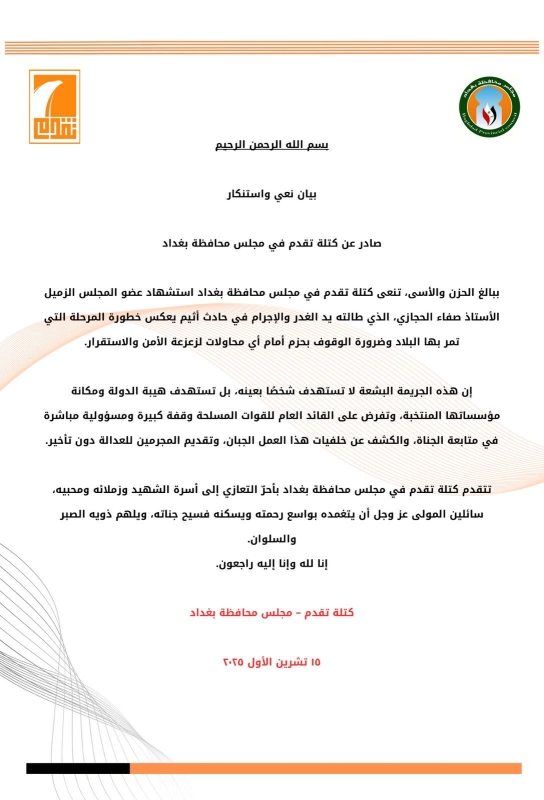 نعت كتلة تقدّم في مجلس محافظة بغداد، اليوم الاربعاء، عضو المجلس الشهيد صفاء الحجازي، الذي اغتيل في حادث وصفته الكتلة بـ "الجبان" و "الإجرامي"، مؤكدة أن الحادث يمثل استهدافاً مباشراً للدولة ومؤسساتها المنتخبة.
