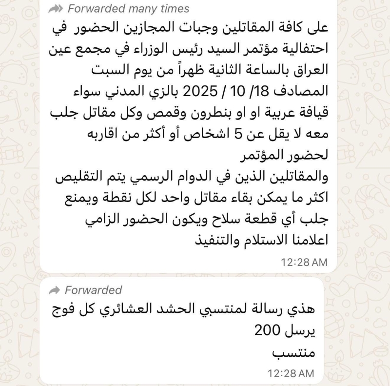 واطلع تلفزيون "الديرة" على نص الرسالة المتداولة، التي لم يتم التثبت من صحتها، والتي جاء فيها، "على كافة المقاتلين وجبات المجازين الحضور في احتفالية مؤتمر السيد رئيس الوزراء في مجمع عين العراق بالساعة الثانية ظهراً من يوم السبت المصادف /10/18 / 2025 بالزي المدني سواء قيافة عربية او بنطرون وقمص وكل مقاتل جلب معه لا يقل عن 5 أشخاص أو أكثر من اقاربه لحضور المؤتمر".