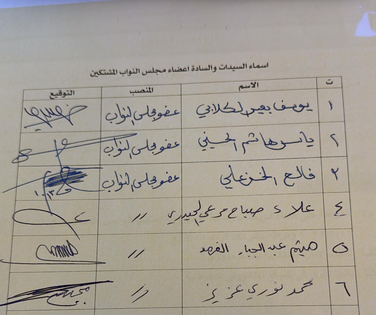 وتضم الشكوى ستة نواب هم: يوسف الكلابي و ياسر الحسيني، وفالح الخزعلي وعلاء الحيدري وهيثم الفهد ومحمد نوري.