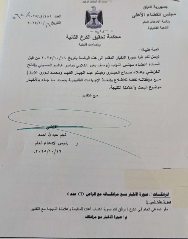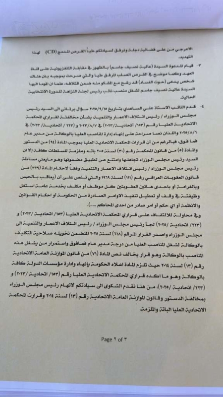 أحالت رئاسة الادعاء في العراق شكوى مرفوعة من عدد من أعضاء مجلس النواب ضد رئيس مجلس الوزراء محمد شياع السوداني إلى المحكمة المختصة للتحقيق في قضايا النزاهة، وذلك بشأن مجموعة من المخالفات القانونية.