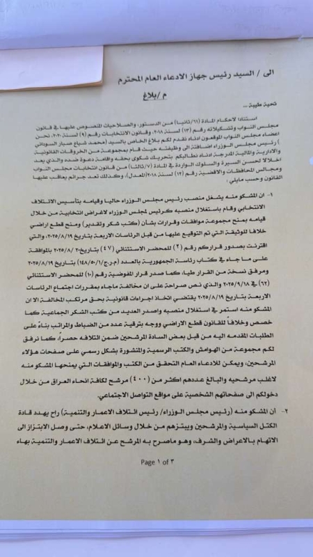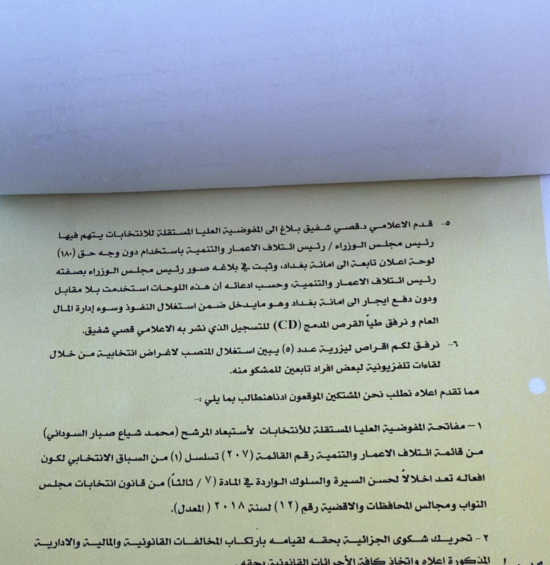 وبحسب وثائق حصل عليها تلفزيون "الديرة" فان "الشكوى طالبت بالتحقيق في عدة مخالفات قانونية، من بينها سعي السوداني لتأسيس ائتلاف انتخابي واستغلال منصبه لأغراض انتخابية. ومن ذلك، إصدار كتب شكر وتقدير ومنح قطع أراضٍ، مخالفاً بذلك الوثيقة الخاصة بنزاهة الانتخابات الموقعة من قبل الرئاسات العراقية الأربع".