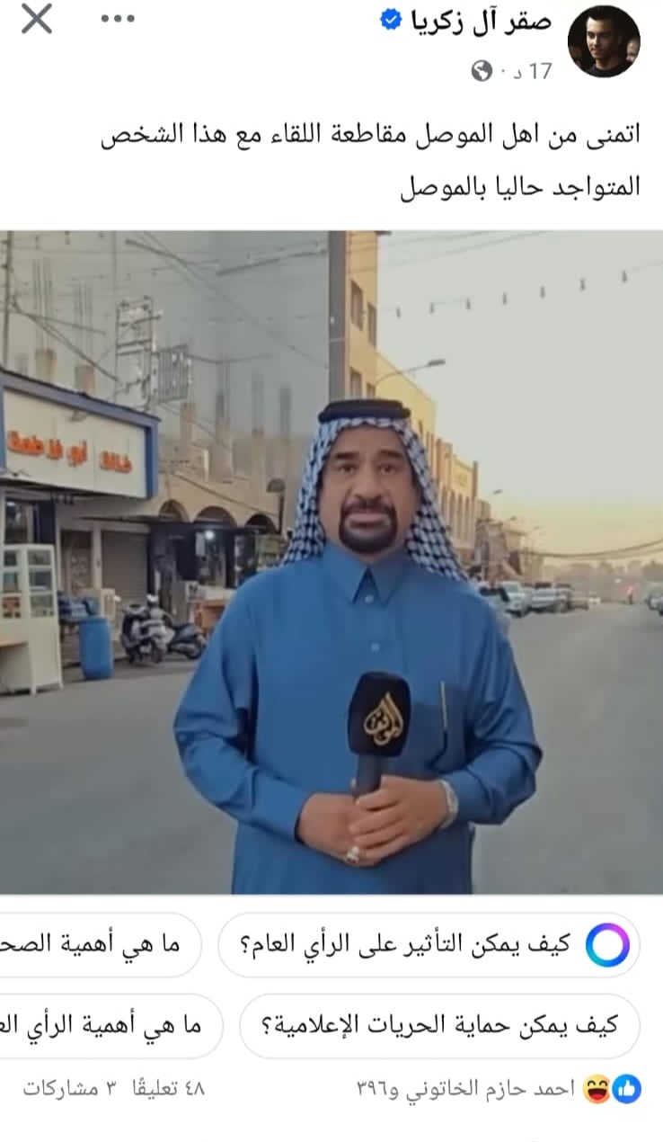دعا الإعلامي والناشط الموصلي المعروف صقر آل زكريا إلى مقاطعة مقدم البرامج الميداني، حسن شويع المعروف بـ"العزيز" في الموصل، بعد أن وصفه بأنه يستغل معاناة الناس البسطاء من أجل تحقيق الشهرة، مؤكداً أن ما يقدمه لا يمتّ للإعلام بصلة.