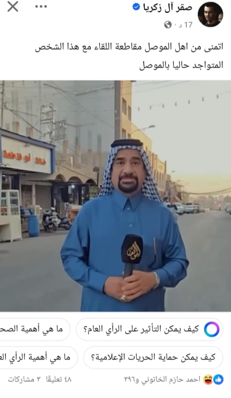 وذكر آل زكريا في منشور على صفحته بفيسبوك اطلع عليه تلفزيون "الديرة"، قائلا إن :"الإعلام اليوم صار بيد ناس ما يعرفون شنو يعني إنسانية ولا كرامة"، مضيفاً :"واحد يطلع يسوي محتوى على حساب الناس البسطاء، يستهزأ بهم ويتنمر على الكبار والمرضى، ويستدرجهم بالكلام حتى يضحك المتابعين".