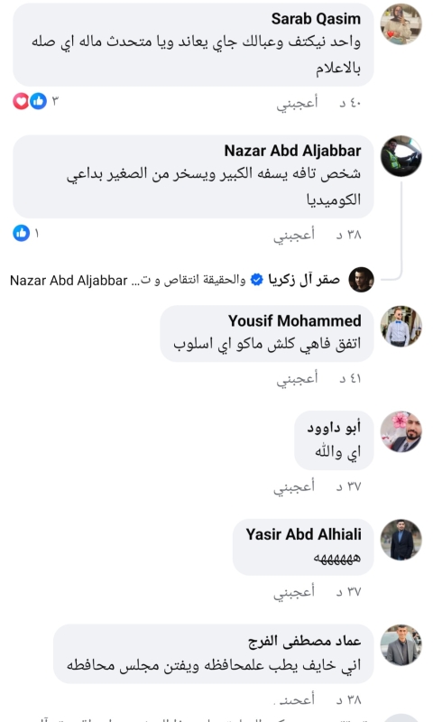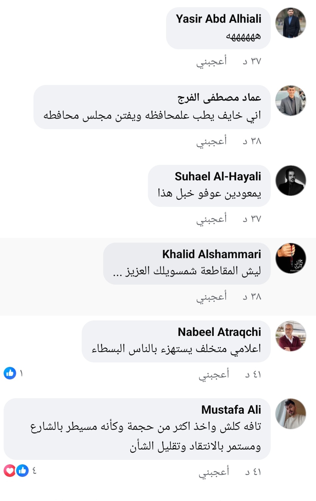 وذكرت سراب قاسم ان "الشخص المعني جاي يعاند ومتحدث ماله أي علاقة بالإعلام"، فيما وصفه نزار عبد الجبار بأنه "تافه يسفه الكبير ويسخر من الصغير بداعي الكوميديا".