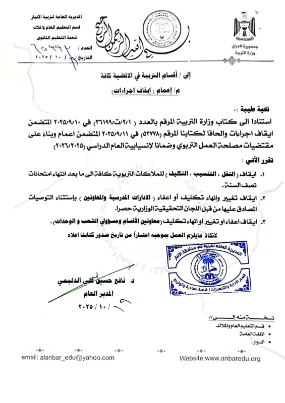 وتحمل الوثيقة توقيع الدليمي وختم المديرية، وتتضمن توجيهاً إلى أقسام التربية في الأقضية كافة بخصوص إيقاف إجراءات النقل والتنسيب والتكليف للملاكات التربوية إلى ما بعد انتهاء امتحانات نصف السنة الدراسية، إضافة إلى إيقاف إصدار أو إنهاء تكليفات جديدة باستثناء التوصيات المعتمدة من الوزارة.