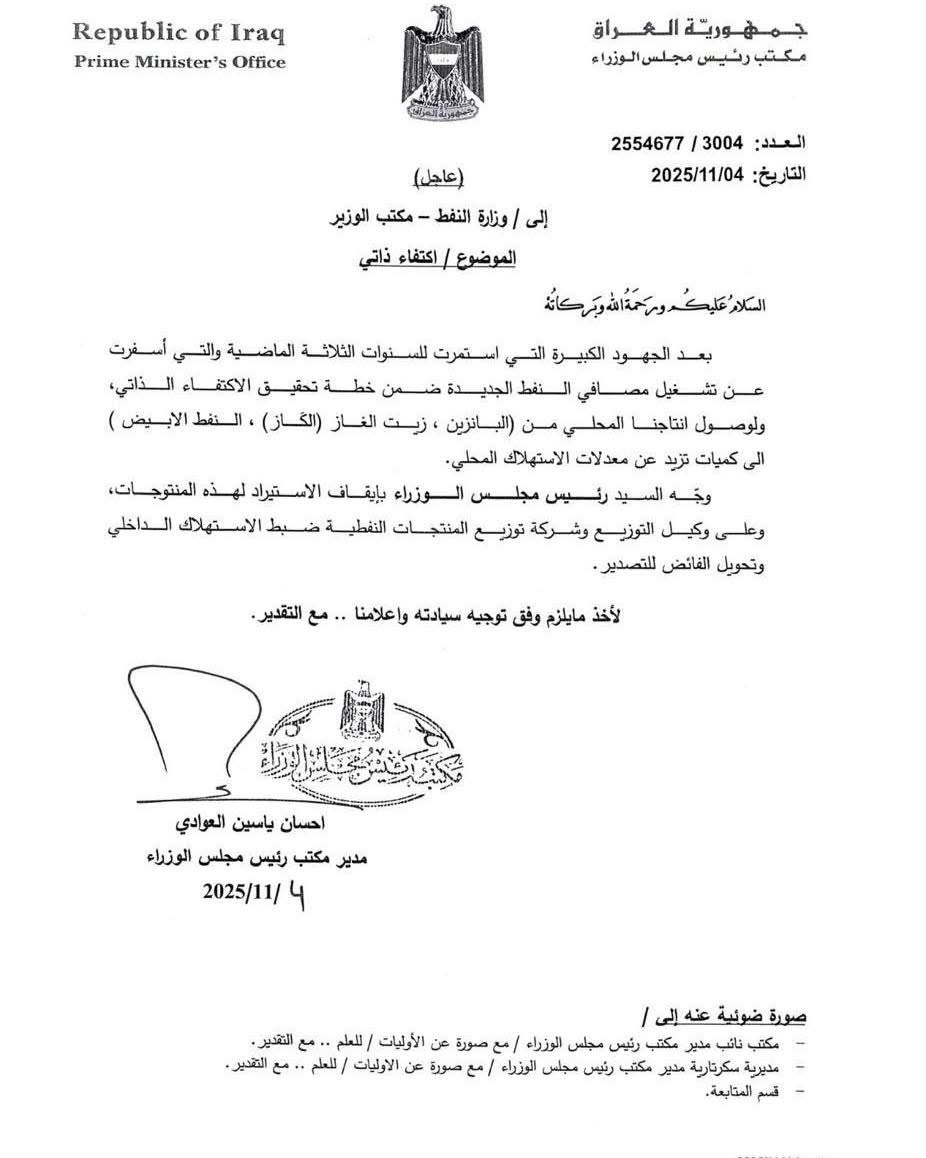 وجه رئيس مجلس الوزراء محمد شياع السوداني، اليوم الثلاثاء، بإيقاف استيراد البنزين وزيت الغاز والنفط الأبيض.