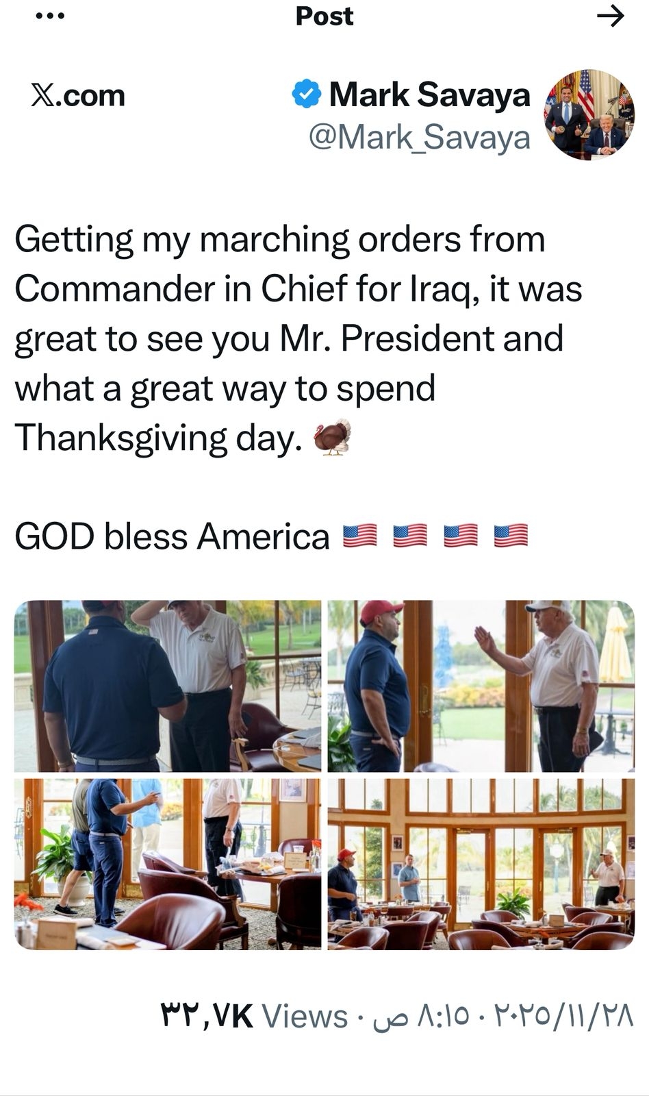 وذكر سافايا في تغريدة على منصة "إكس" قال فيها: "تلقيت توجيهاتي من القائد الأعلى بشأن العراق، كان من الرائع رؤيتك يا سيادة الرئيس، ويا لها من طريقة جميلة لقضاء يوم عيد الشكر حفظ الله أمريكا".