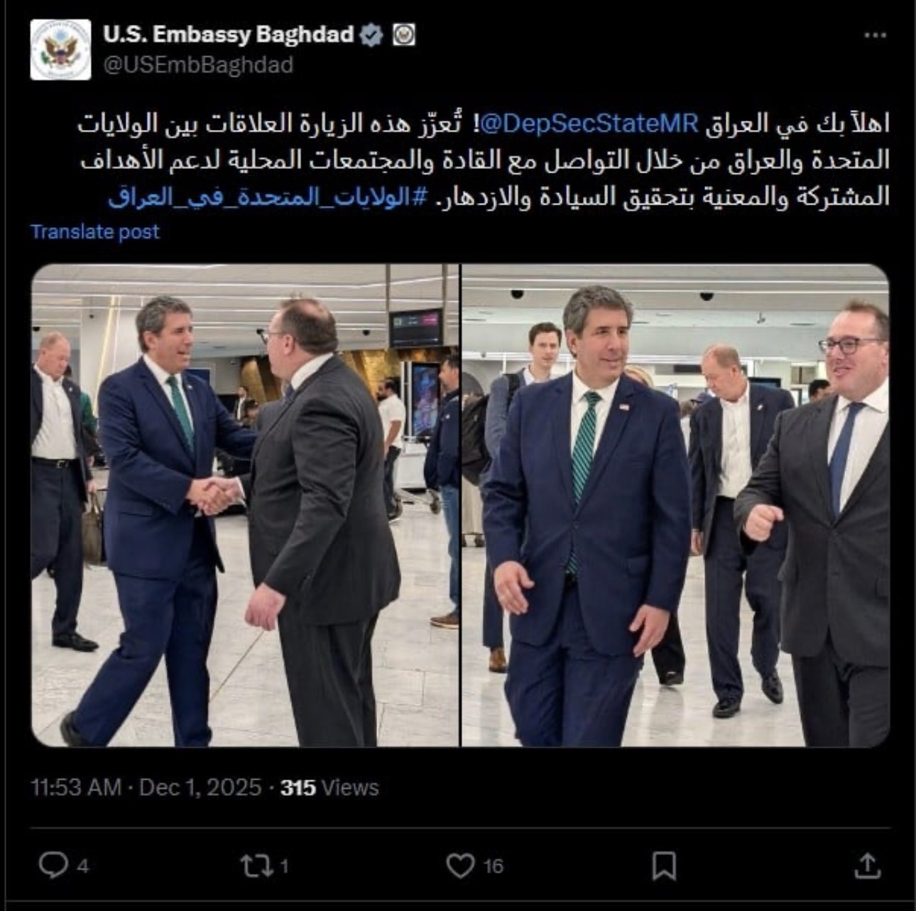ونشرت السفارة الأمريكية في العراق تدوينة مصحوبة بصورتين لوصول ريغاس جاء فيها "اهلاً بك في العراق. تُعزّز هذه الزيارة العلاقات بين الولايات المتحدة والعراق من خلال التواصل مع القادة والمجتمعات المحلية لدعم الأهداف المشتركة والمعنية بتحقيق السيادة والازدهار".