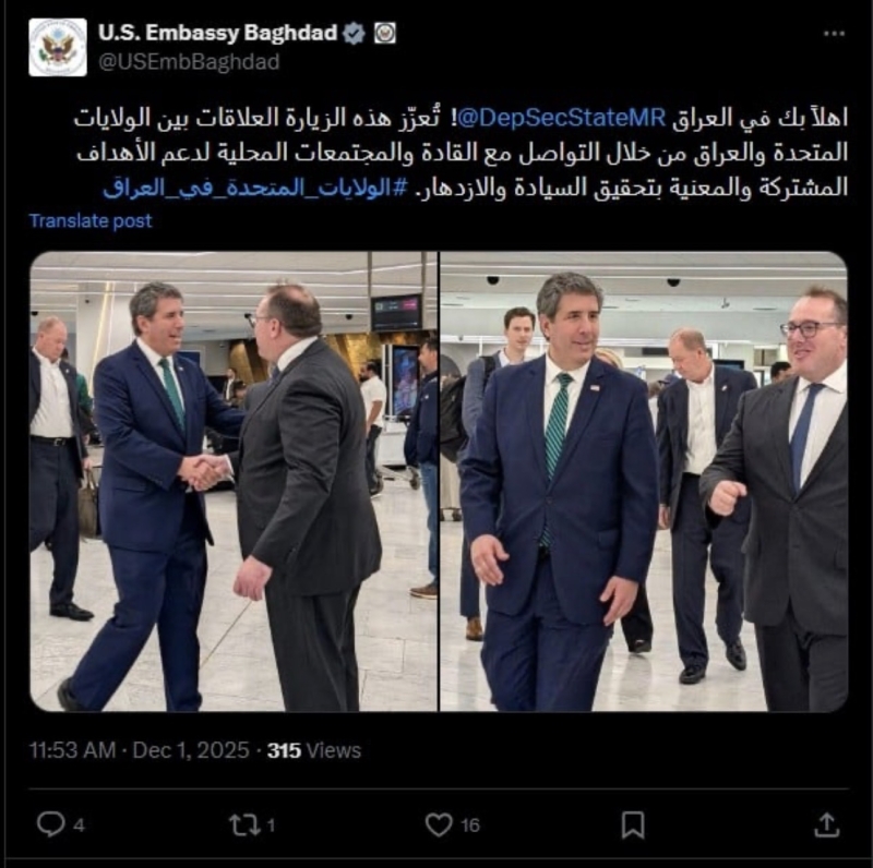 وصل نائب وزير الخارجية الأمريكي مايكل ريغاس، اليوم الاثنين، الى العراق في زيارة رسمية.