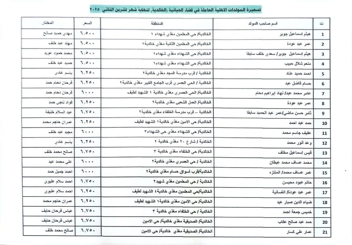 أعلنت قائممقامية الحبانية، اليوم الاثنين، التسعيرة الرسمية لتشغيل المولدات الأهلية لشهر تشرين الثاني 2025.