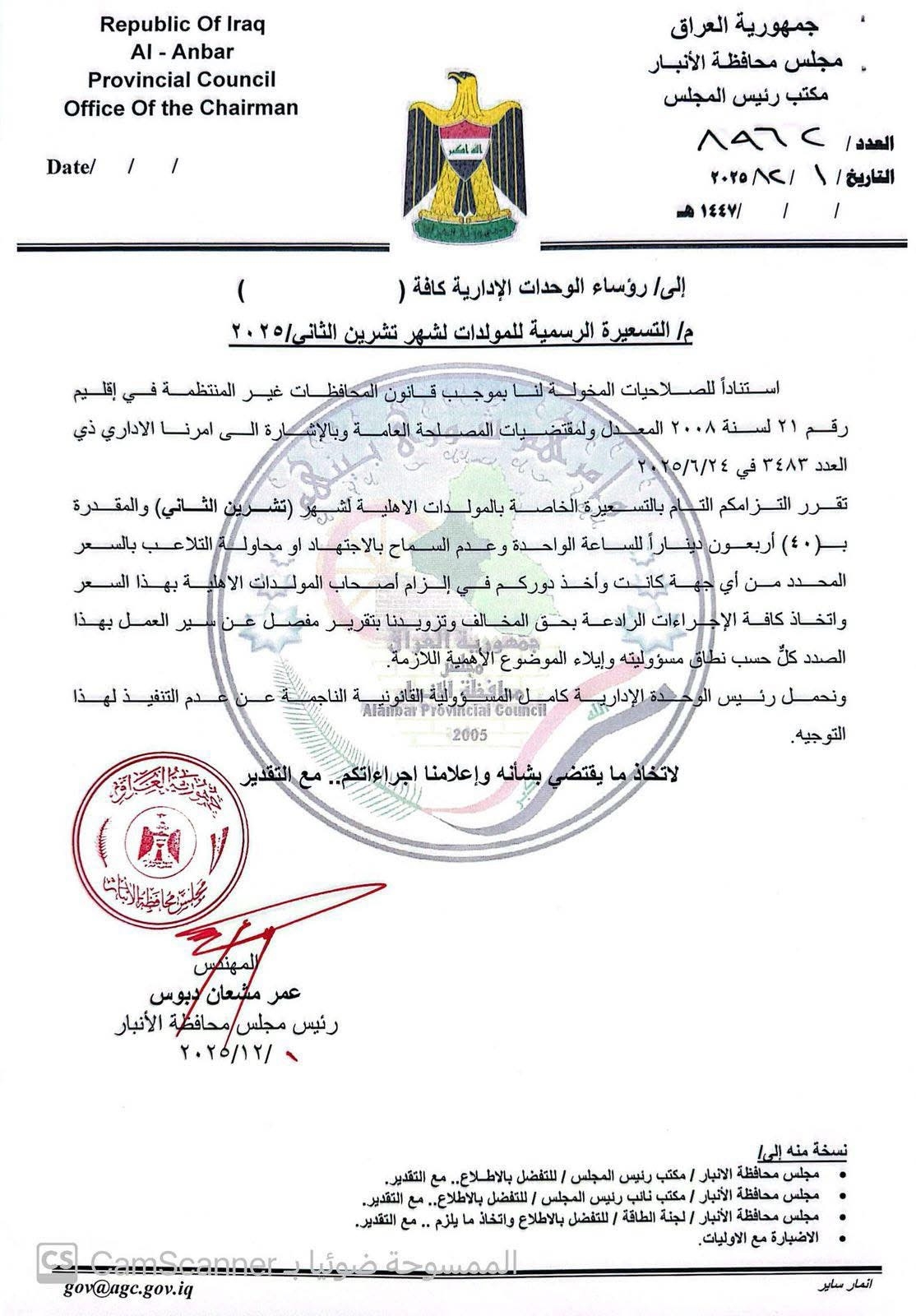 أصدر مجلس محافظة الأنبار، تسعيرة التشغيل الرسمية الخاصة بالمولدات الأهلية لشهر تشرين الثاني 2025، محددةً بـ 40 دينارًا فقط للساعة.