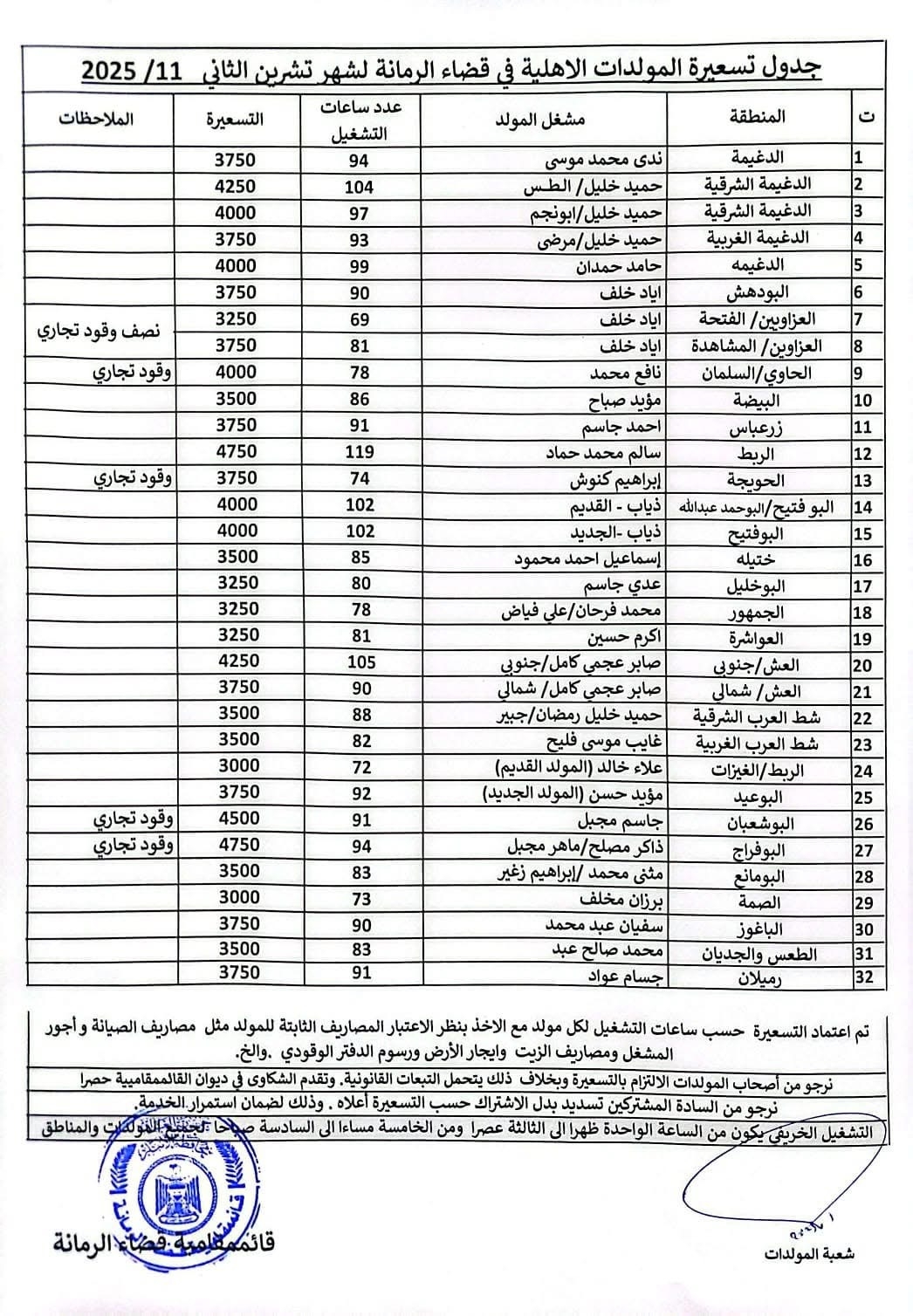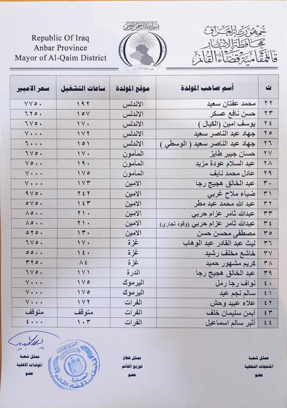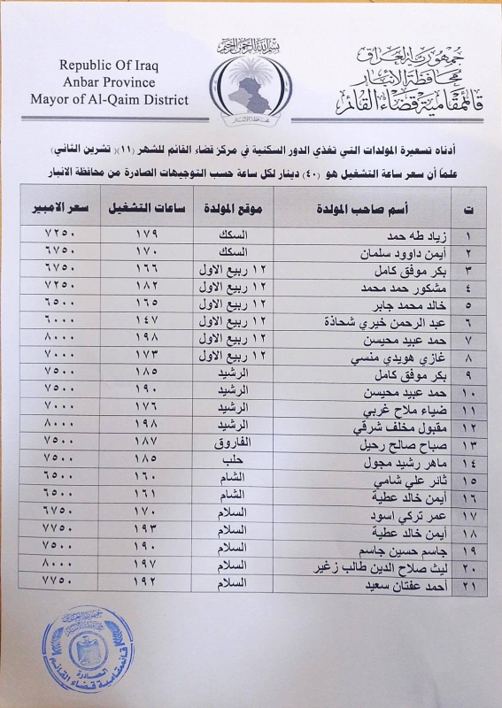 أعلنت قائممقاميتا القائم والرمانة، اليوم الثلاثاء، التسعيرة الرسمية لتشغيل المولدات الأهلية لشهر تشرين الثاني 2025.