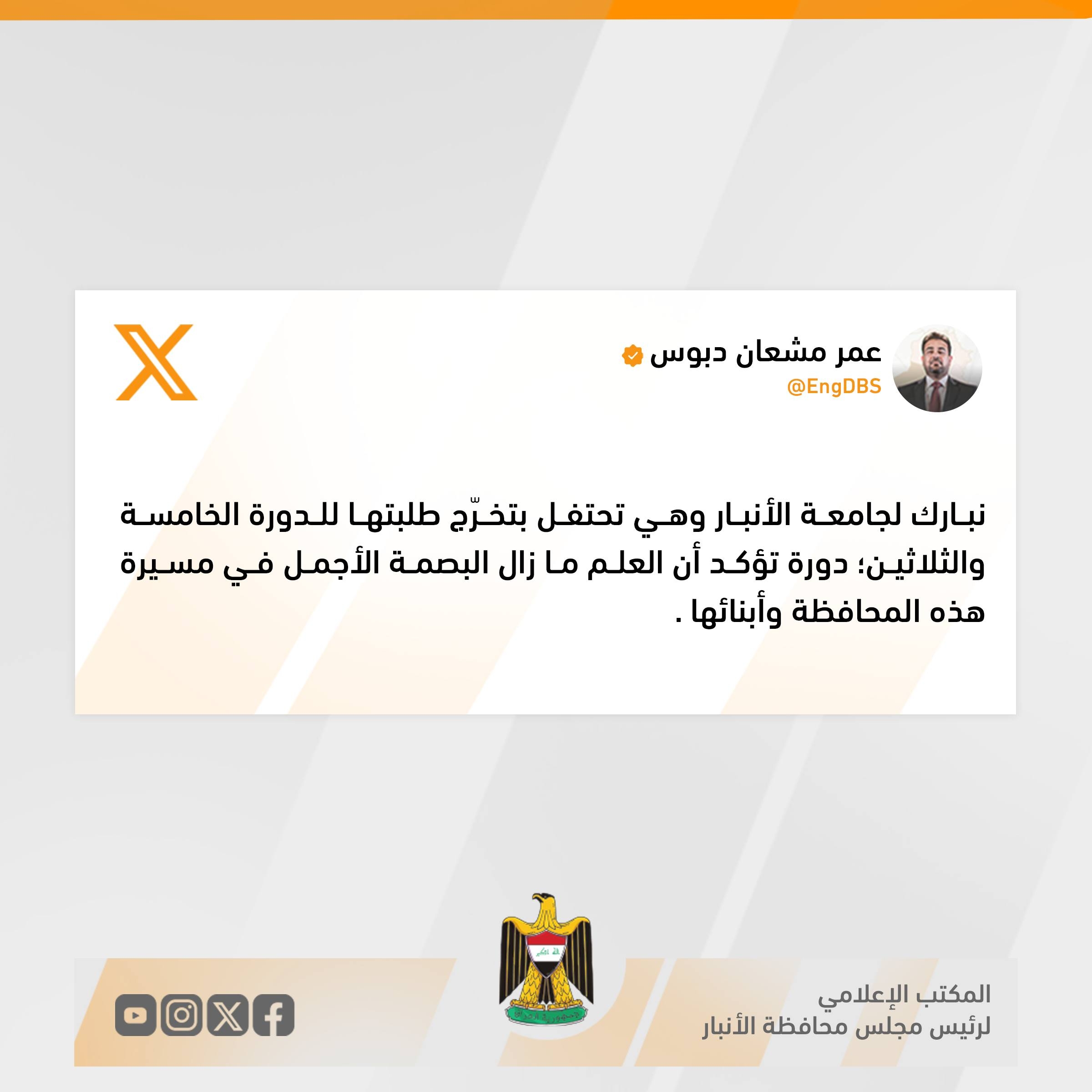 وكتب دبوس تغريدة عبر حسابه في منصة إكس تابعتها "الديرة"، قال فيها: "نبارك لجامعة الأنبار وهي تحتفل بتخرّج طلبتها للدورة الخامسة والثلاثين؛ دورة تؤكد أن العلم ما زال البصمة الأجمل في مسيرة هذه المحافظة وأبنائها".
