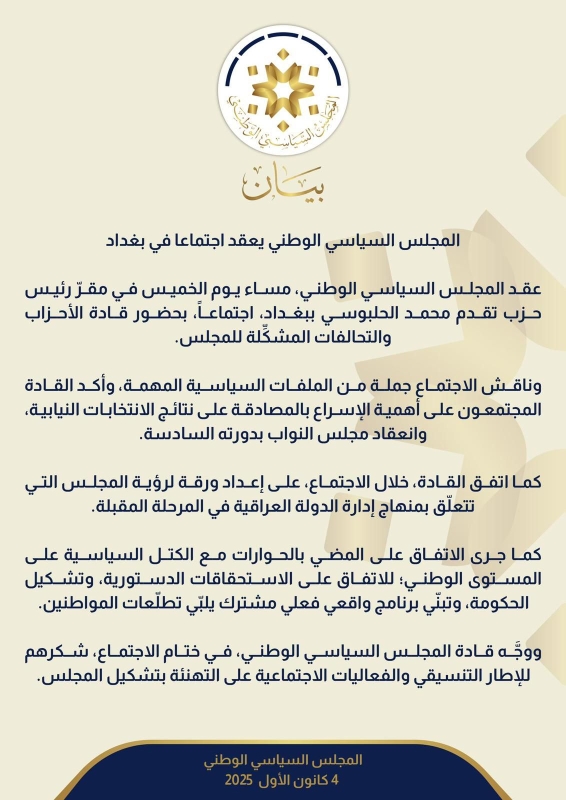 وصدر المجلس بياناً بعد انتهاء الاجتماع، تلقته "الديرة"، جاء فيه إن "الاجتماع ناقش جملةً من الملفات السياسية المهمة، وأكد القادة المجتمعون على أهمية الإسراع بالمصادقة على نتائج الانتخابات النيابية وانعقاد مجلس النواب بدورته السادسة".
