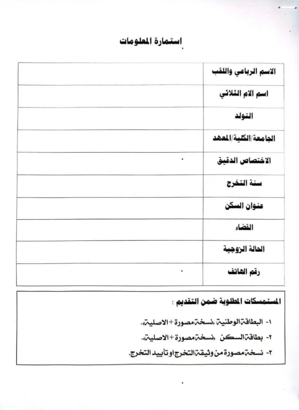 كما أوضح البيان ان "المستمسكات المطلوبة تشمل الآتي: فايل جمهوري، استمارة المعلومات المدرجة ادناه، البطاقة الموحدة الأصلية مع نسخة مصورة، بطاقة السكن الأصلية مع نسخة مصورة، نسخة مصورة من وثيقة التخرج أو تأييد التخرج".