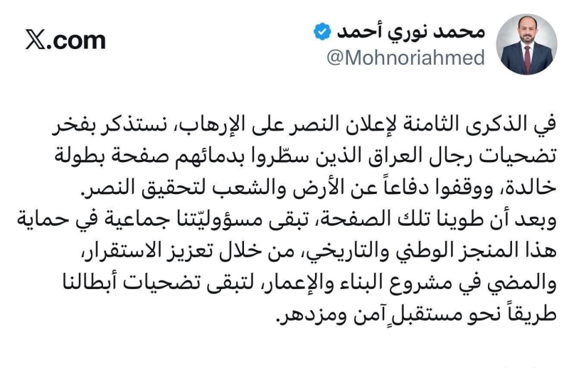 هنّأ محافظ الأنبار، محمد نوري، بمناسبة الذكرى الثامنة لإعلان النصر على الإرهـ..ـاب.