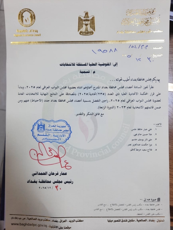 طلب رئيس مجلس محافظة بغداد، عمار فرحان الحمداني، اليوم الثلاثاء، من المفوضية العليا المستقلة للانتخابات تسمية أعضاء جدد من قائمة الاحتياط، بدلا عن الأعضاء الفائزين بعضوية مجلس النواب لعام 2025، بعد مصادقة المحكمة الاتحادية العليا على النتائج النهائية للانتخابات.
