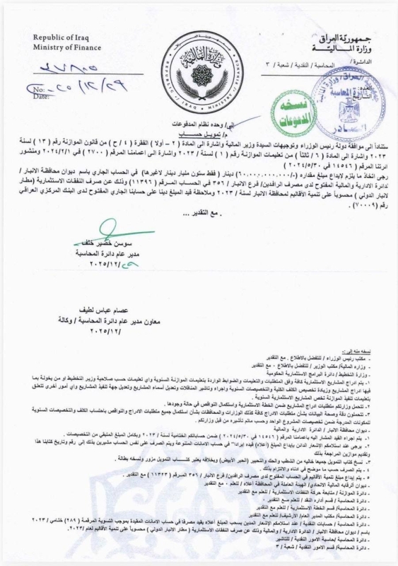 وبينت الوثيقة أن "المبلغ جرى إيداعه في الحساب الجاري باسم ديوان مجلس محافظة الأنبار، ضمن الإجراءات المالية المعتمدة الخاصة بالمشاريع الاستثمارية".