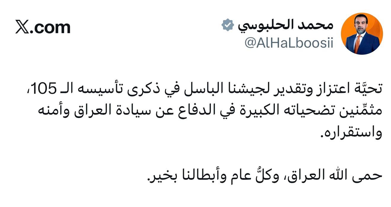 وكتب الرئيس الحلبوسي في تغريدة على منصة (x) تابعها تلفزيون "الديرة" "تحيَّة اعتزاز وتقدير لجيشنا الباسل في ذكرى تأسيسه الـ 105، مثمِّنين تضحياته الكبيرة في الدفاع عن سيادة العراق وأمنه واستقراره.