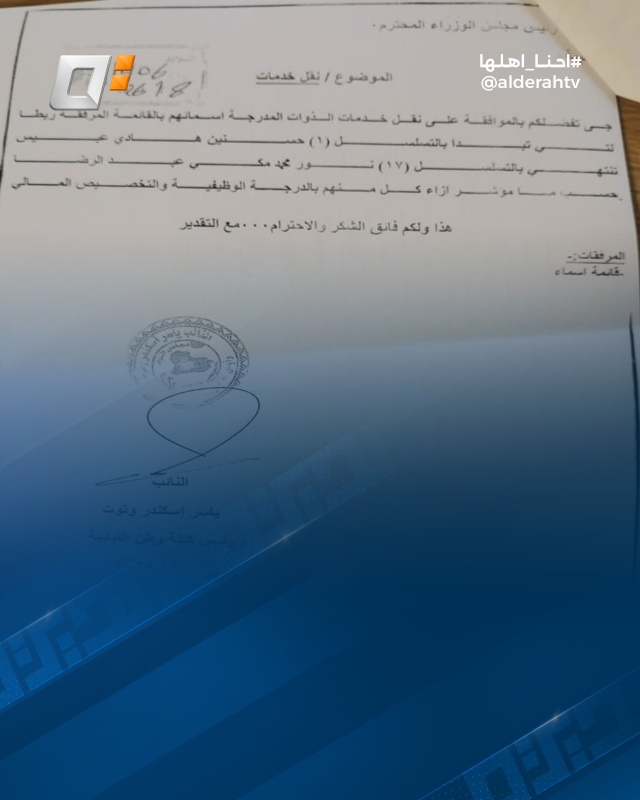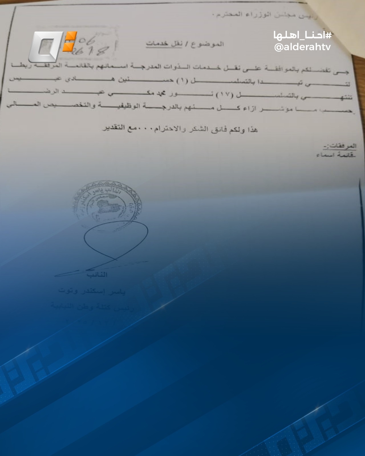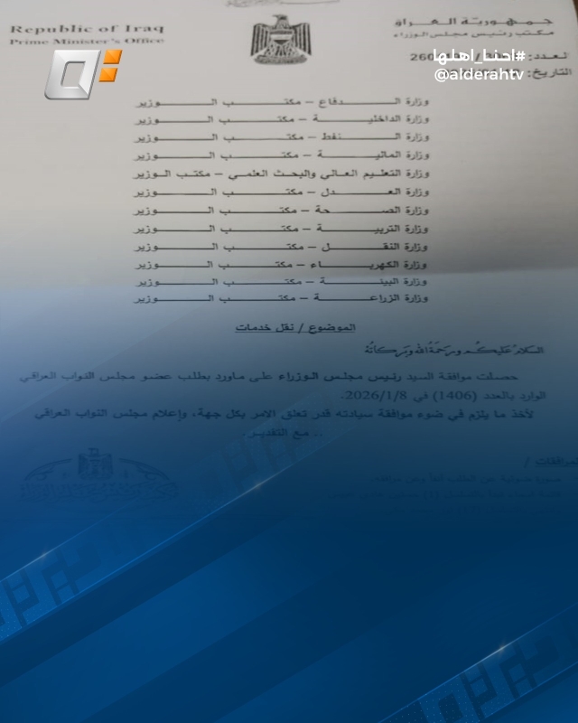 وبحسب الوثائق الصادرة عن مكتب رئيس الوزراء، والموقعة من مدير المكتب علي رزوقي، حصل تلفزيون "الديرة" على نسخة منها فإن الموافقة جاءت بناءً على طلب قدمه نائب عن ائتلاف الإعمار والتنمية الذي يترأسه رئيس الوزراء المنتهية ولايته محمد شياع السوداني، ونصت على نقل الموظفين إلى وزارات سيادية ذات امتيازات مالية أعلى.
