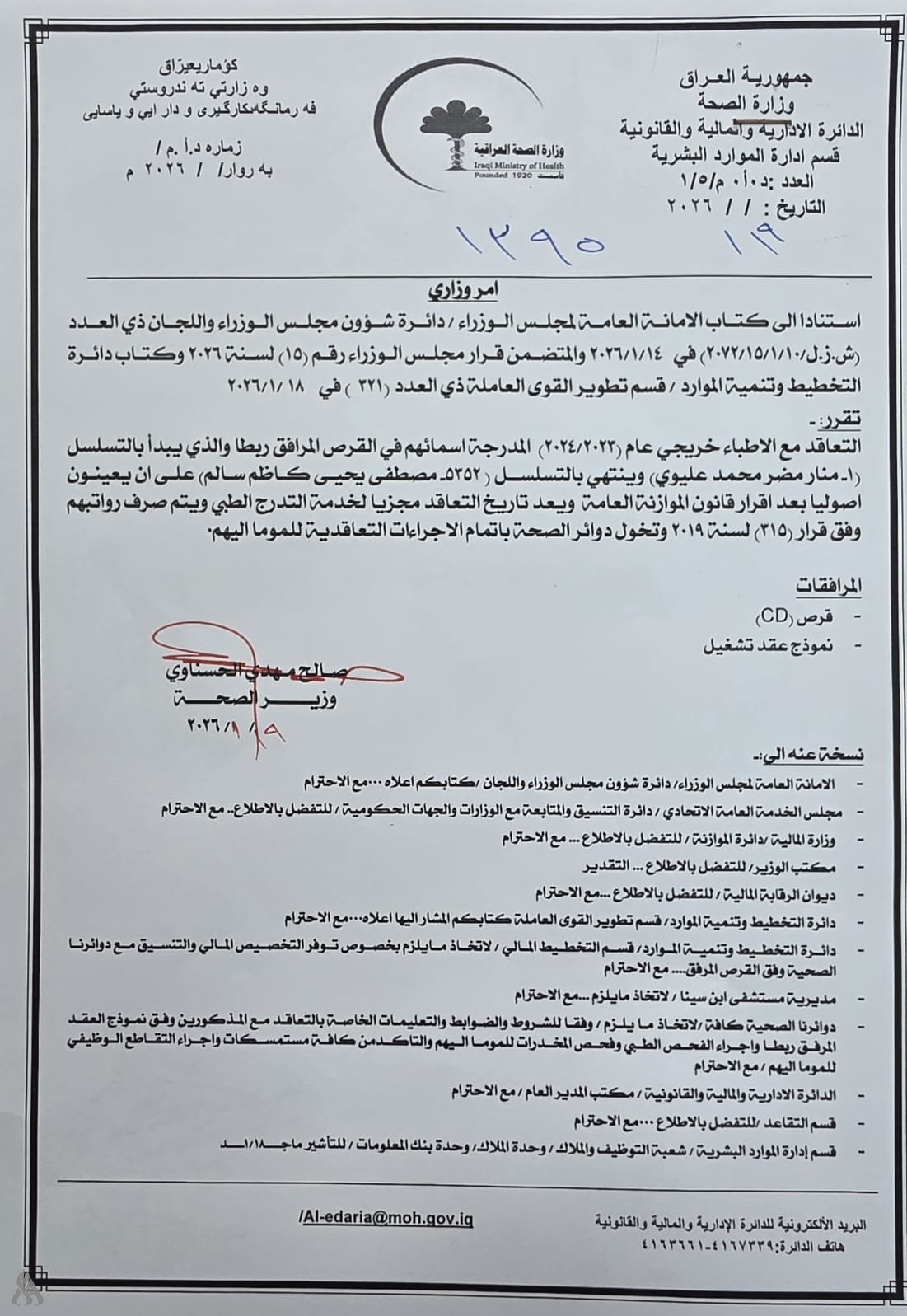 وأضافت "يعد تاريخ التعاقد مجزياً لخدمة التدرج الطبي ويتم صرف رواتبهم وفق قرار (315) لسنة 2019 وتخول دوائر الصحة بإتمام الإجراءات التعاقدية للموما إليهم".