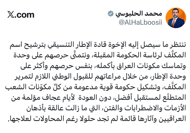 وقال الرئيس الحلبوسي في تدوينة على موقع “إكس” وتلقاها تلفزيون “الديرة”: “ننتظر ما سيصل إليه الإخوة قادة الإطار التنسيقي بترشيح اسم المكلّف لرئاسة الحكومة المقبلة”.