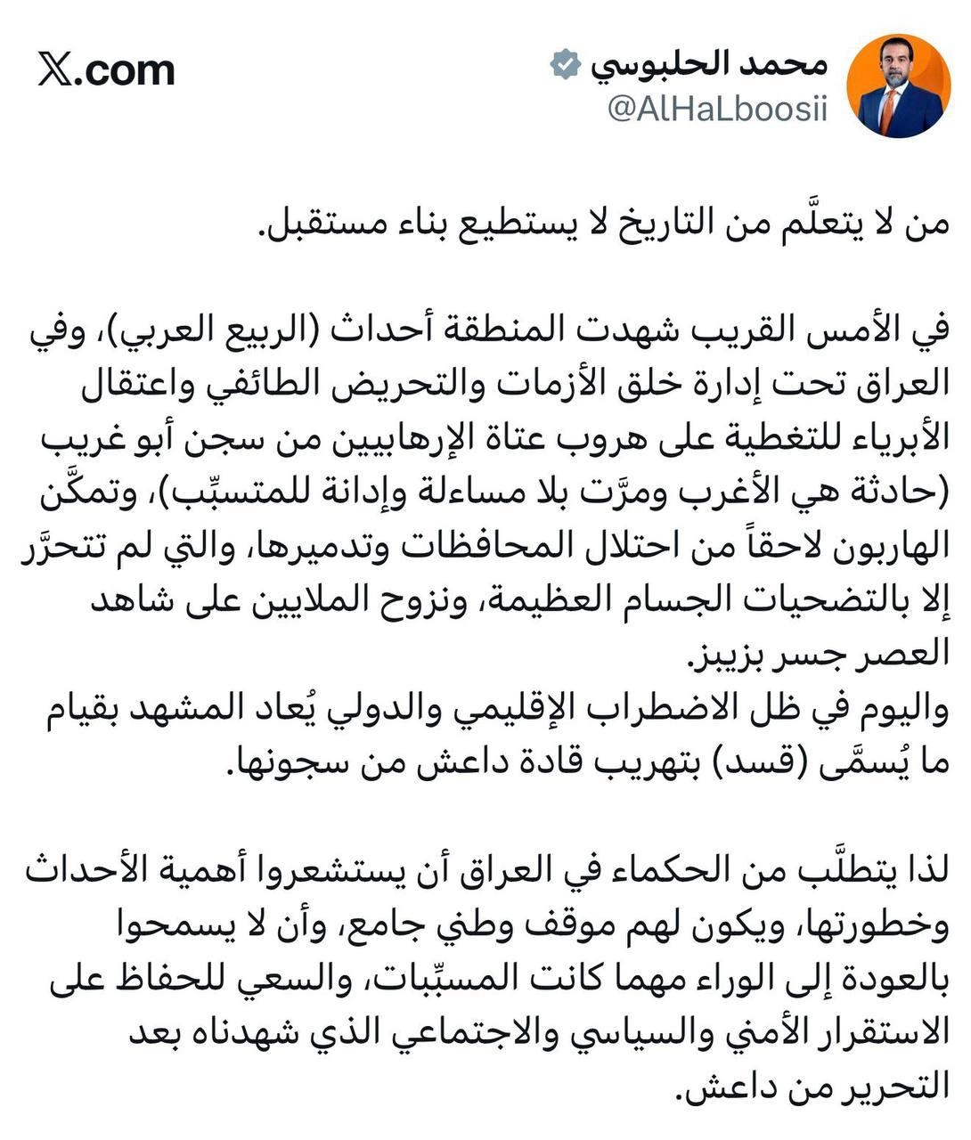 وقال الرئيس الحلبوسي في تدوينة على موقع "اكس" وتلقاها تلفزيون "الديرة"، إن "من لا يتعلم من التاريخ لا يستطيع بناء مستقبل، في الأمس القريب شهدت المنطقة أحداث الربيع العربي، وفي العراق تحت إدارة خلق الأزمات والتحريض الطائفي واعتقال الأبرياء للتغطية على هروب عتاة الإرهابيين من سجن أبو غريب (حادثة هي الأغرب ومرَّت بلا مساءلة وإدانة للمتسبب)، وتمكن الهاربون لاحقاً من احتلال المحافظات وتدميرها، والتي لم تتحرر إلا بالتضحيات الجسام العظيمة، ونزوح الملايين على شاهد العصر جسر بزيبز".