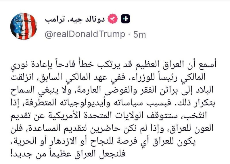 وقال ترمب في تدوينة تابعها تلفزيون "الديرة"، إنه "سمع أن العراق (العظيم) قد يعيد المالكي إلى رئاسة الحكومة"،مشدداً على أن "سياساته وأيديولوجيته (المتطرفة) لا ينبغي السماح بتكرارها.
