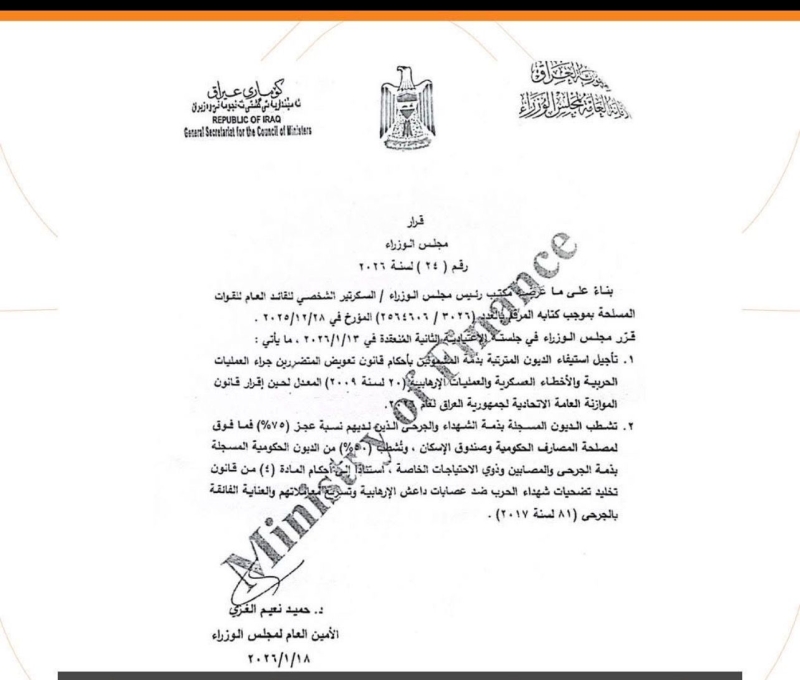 وبحسب وثيقة صادرة عن الأمانة العامة لمجلس الوزراء، فإن القرار شمل تأجيل استيفاء الديون المترتبة بذمة المشمولين بالقانون المذكور، لحين إقرار قانون الموازنة العامة الاتحادية.