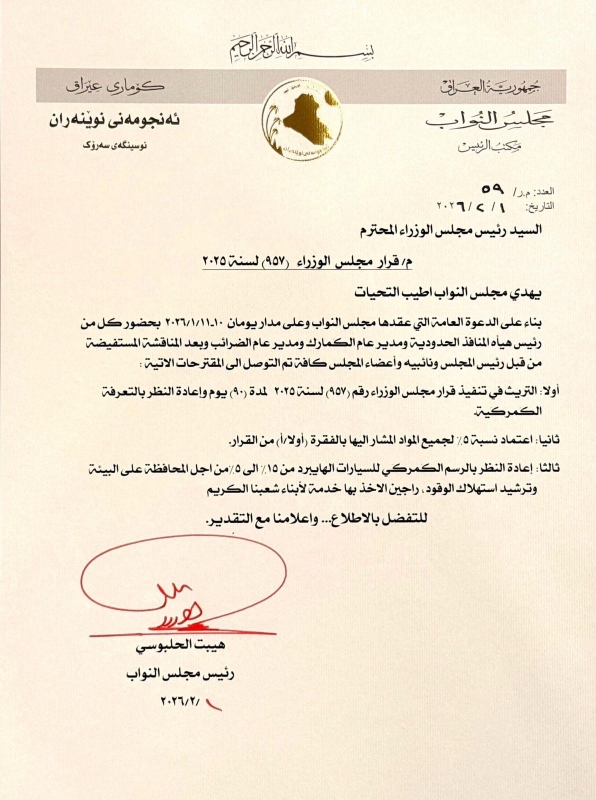 وبحسب وثيقة صادرة عن رئاسة مجلس النواب، وردت لتلفزيون "الديرة"، فإن الدعوة جاءت استناداً إلى اجتماع عقده المجلس على مدى يومين بحضور رئيس هيئة المنافذ الحدودية، ومدير عام الكمارك، ومدير عام الضرائب، جرت خلاله مناقشة تداعيات القرار.