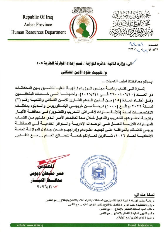 وبحسب وثيقة صادرة عن المحافظ حصل تلفزيون "الديرة"، على نسخة منها أن "المتعاقدين جرى تعيينهم استناداً إلى قانون الدعم الطارئ للأمن الغذائي والتنمية رقم (2) لسنة 2022، بعقود امتدت لثلاث سنوات، خضعوا خلالها لبرامج تدريب وتأهيل داخل المؤسسات الحكومية في الأنبار، ما أسهم في تعزيز كفاءتهم واكتسابهم الخبرة اللازمة للعمل في الوحدات الإدارية والدوائر الخدمية".