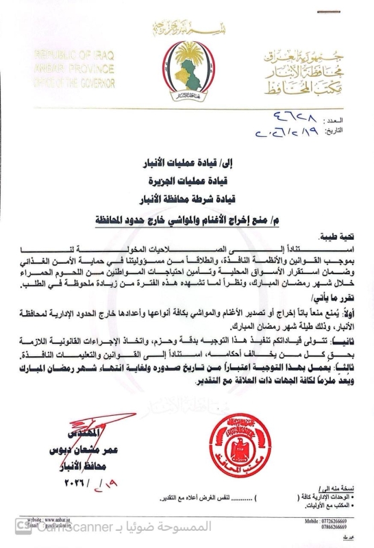 وأضافت الوثيقة أنه: "تقرر أولاً: يُمنع منعًا باتًا إخراج أو تصدير الأغنام والمواشي بكافة أنواعها وأعدادها خارج الحدود الإدارية لمحافظة الأنبار، وذلك طيلة شهر رمضان المبارك. ثانيًا: تتولى قياداتكم تنفيذ هذا التوجيه بدقة وحزم، واتخاذ الإجراءات القانونية اللازمة بحق كل من يخالف أحكامه، استناداً إلى القوانين والتعليمات النافذة".