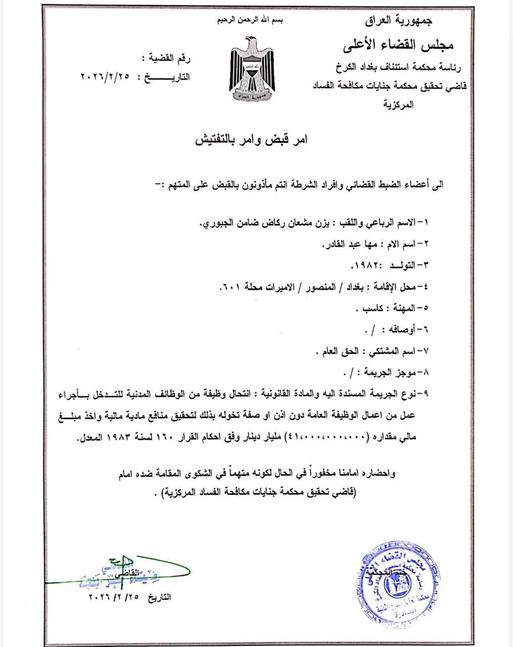 - هناك وثيقة متداولة صادرة عن قاضي النزاهة ضياء جعفر توضح تفاصيل أمر القبض على يزن مشعان الجبوري.
