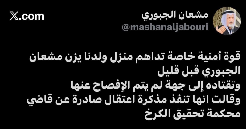 - في ساعة متأخرة من الليل دهمت قوة أمنية منزل يزن مشعان الجبوري وشقيقه.