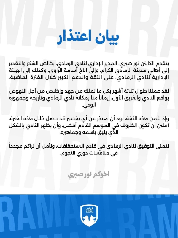 🔶 قدم المدير الإداري لنادي الرمادي، الكابتن نور صبري، خالص الشكر والتقدير إلى أهالي مدينة الرمادي، وإلى رئيس نادي الرمادي، والهيئة الإدارية، على الثقة والدعم الكبير خلال الفترة الماضية.