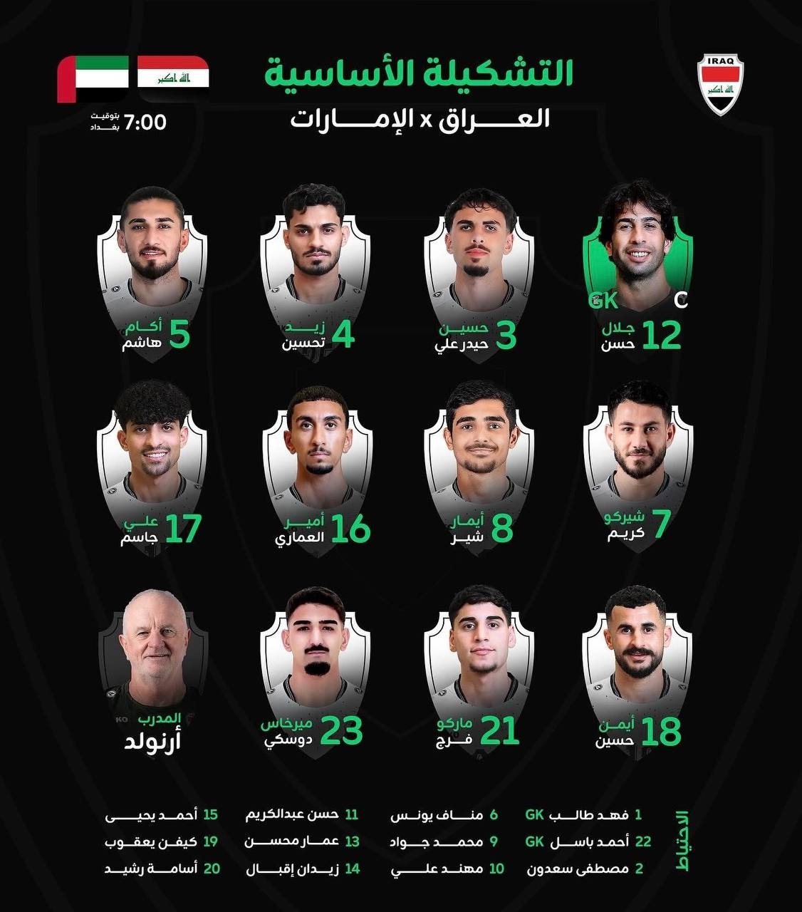 تشكيلة أسود الرافدين لمواجهة الإمارات في مباراة اليوم